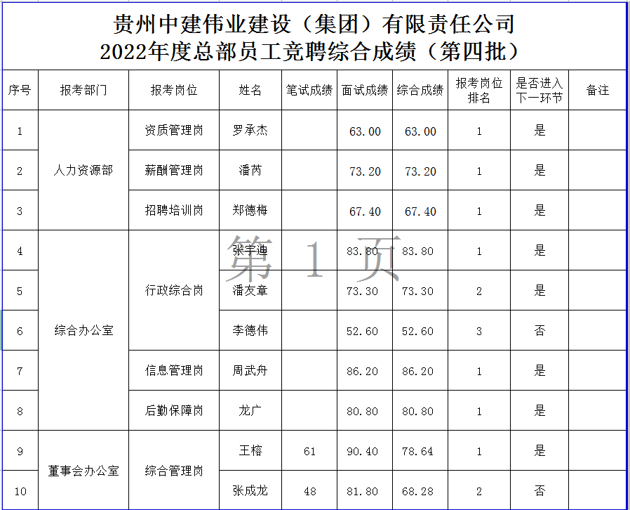 根据《贵州中建伟业建设(集团)有限责任公司总部员工竞聘方案(第四批)》规定,经报名、资格审查、面试等程序,现将综合成绩予以公示。