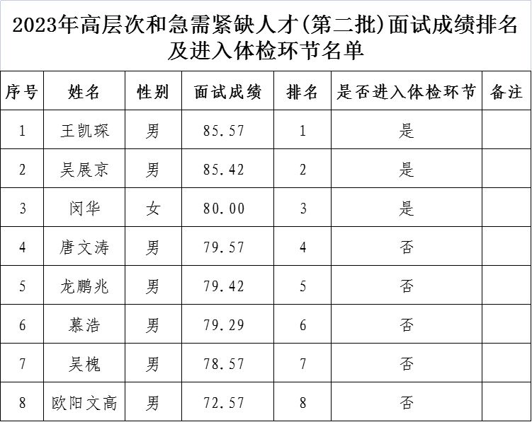 附件:2023年高层次和急需紧缺人才(第二批)面试成绩排名及进入体检环节名单